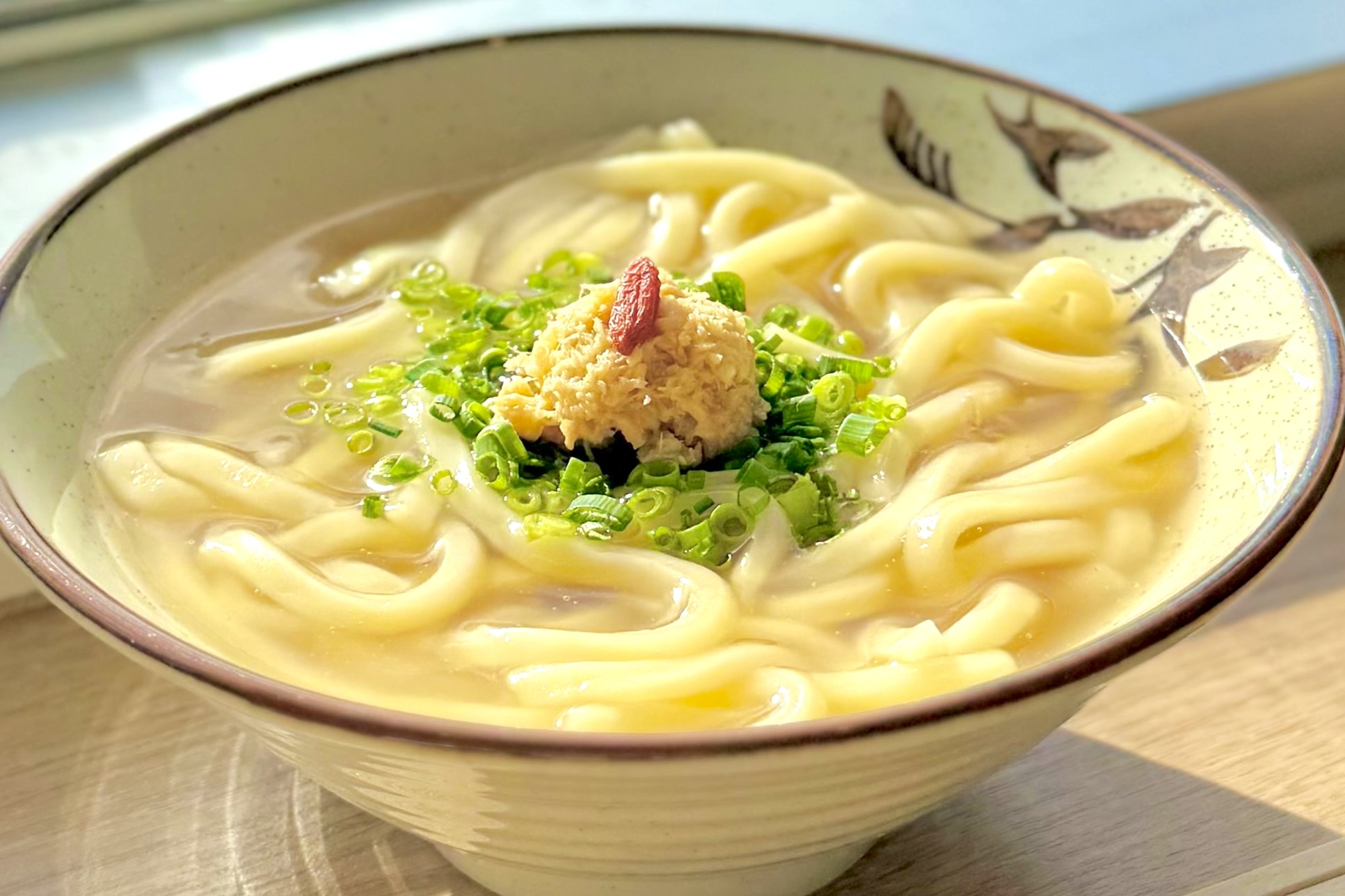 うどんに「ねぎ・天かす・わかめ・かまぼこ」をトッピングした、香川県伝統のうどん。