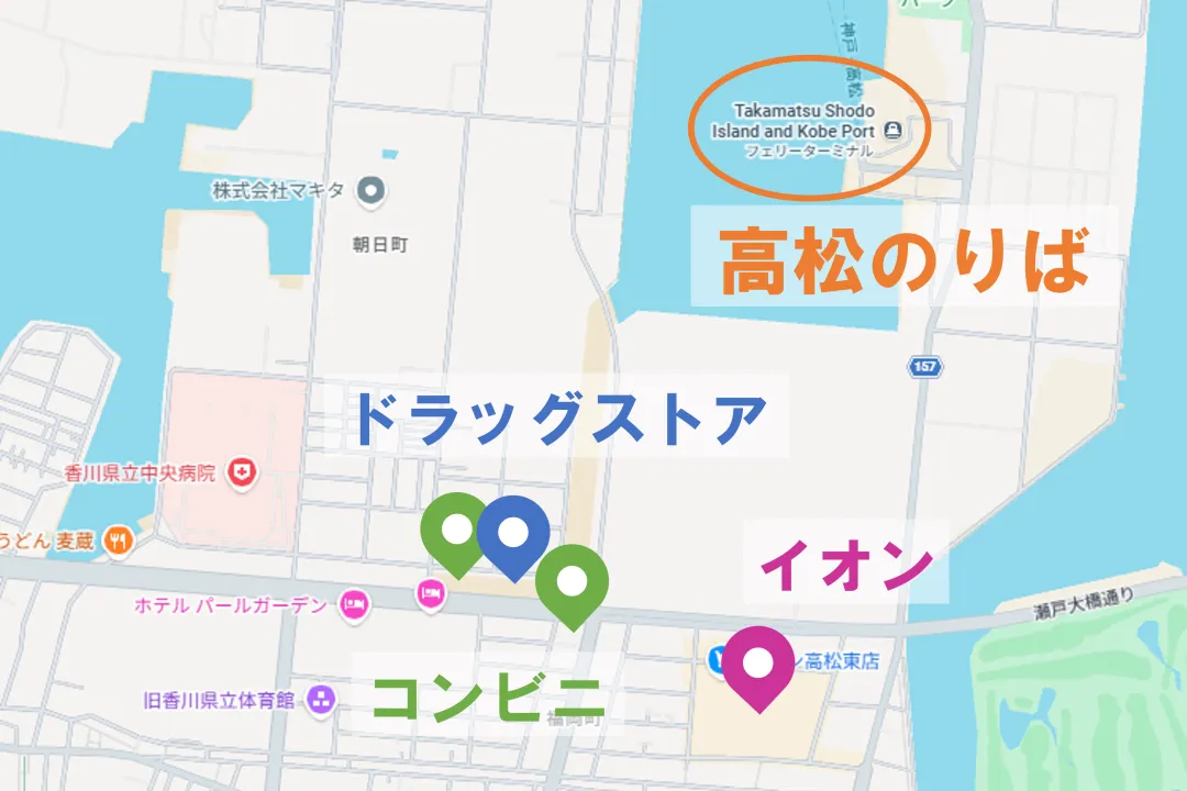 フェリーの待ち時間に、「少し買い物に行きたいな」と思ったら、LUUPで気軽に町なかへ。自転車で約10分のところには、イオンやコンビニ、ドラッグストアなどが並びます。