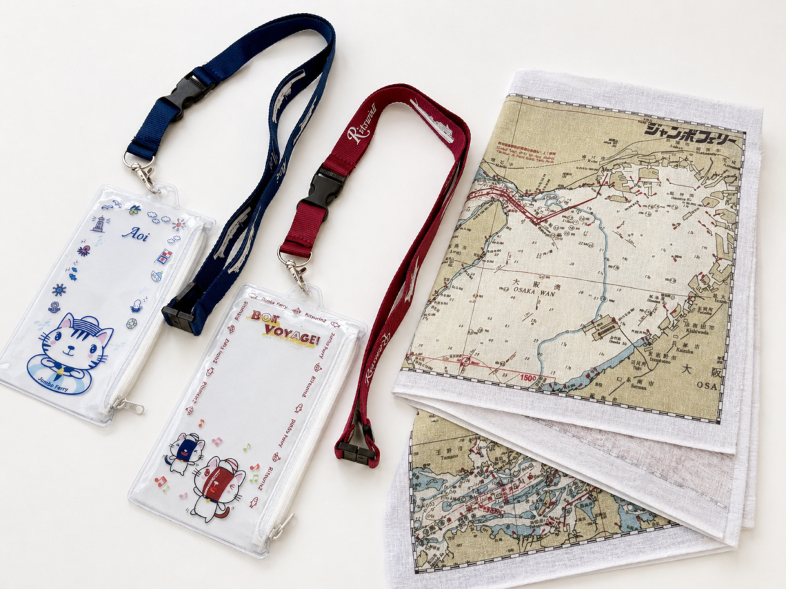 2026年4月29日(水)上下1便より販売を開始するのは、海図手ぬぐい、ネックストラップ、スライダーケースの3種類です。