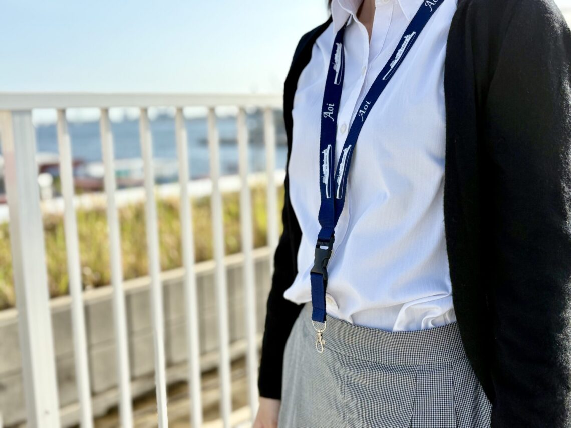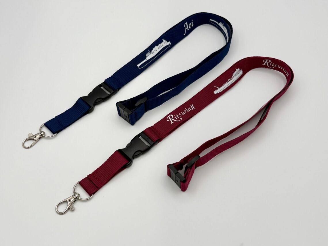 それぞれ「あおい」「りつりん2」の特徴的な船のシルエットと船名をデザインしました。長さを調整できるので、子供から大人までご使用いただけます。