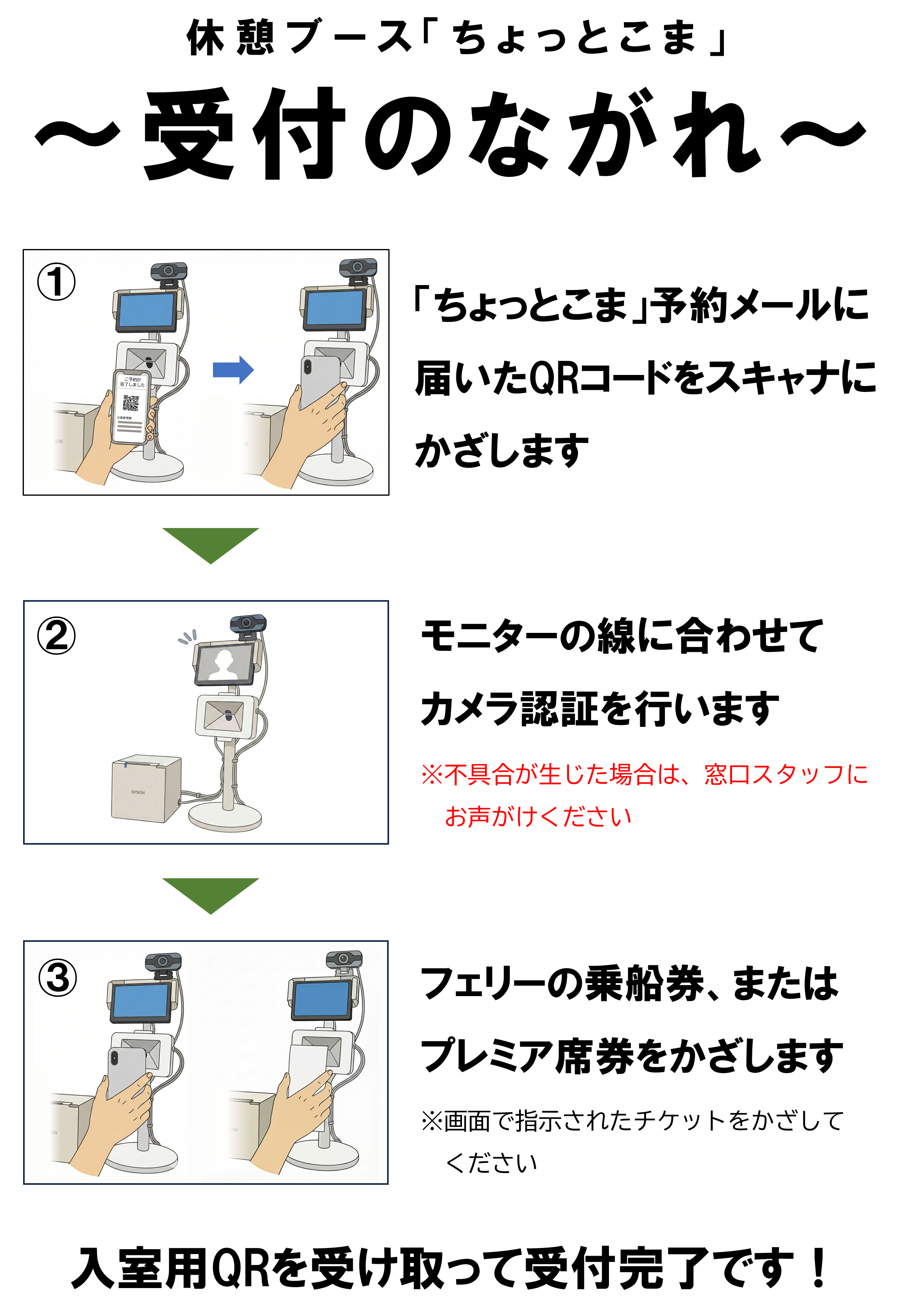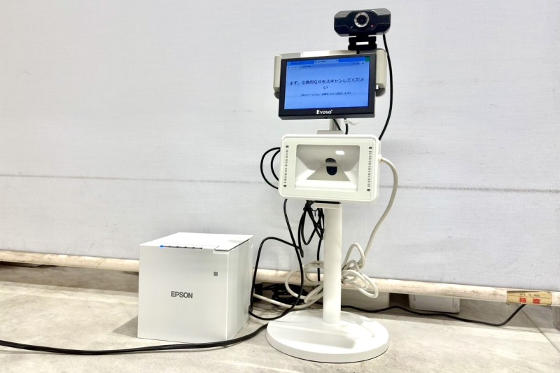 「ちょっとこま」予約メールに届いた引換用QRを、発券窓口の受付機にかざして入室券を受け取ります。