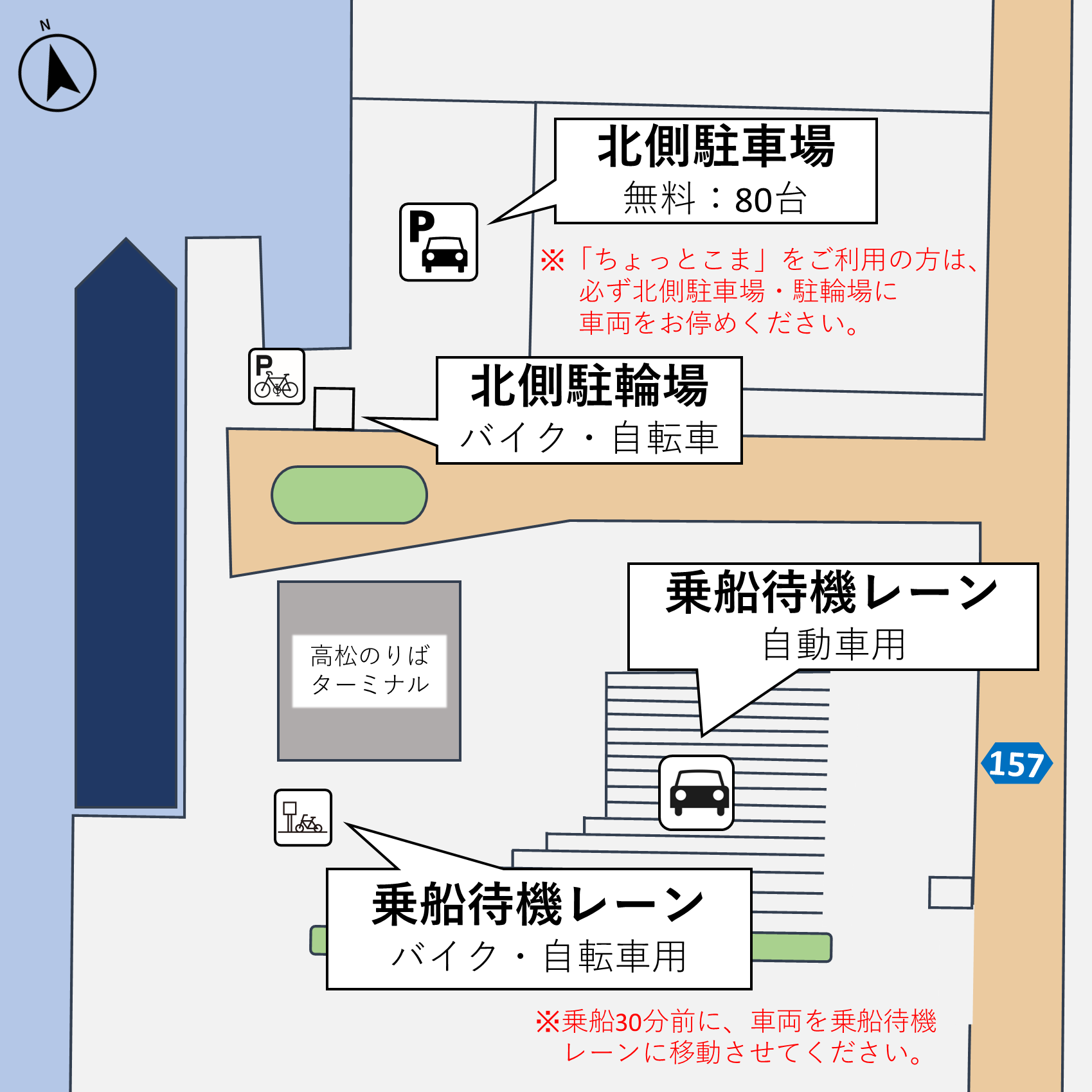 - 「ちょっとこま」ご利用後、車両と一緒にフェリーへご乗船されるお客様は、出港時刻の30分前までに港南側の乗船待機レーンへ車両を移動してください。
