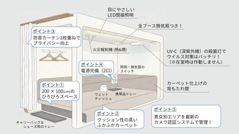 防音材の壁でしっかりと区切られた1名様用のブース。周囲を気にせず、静かにリラックスできるプライベート空間です。(入り口はカーテン仕様のため、周囲に音が漏れることがあります。) さらに、床はふかふかのカーペット敷きで、やわらかな感触で快適にお過ごしいただけます。