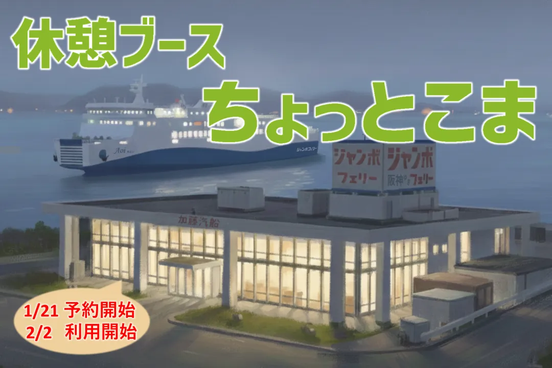 香川の方言で「少しの間」を意味する言葉。「待ち時間が長くて疲れる」「到着が早朝で動きづらい」といったお客様のお声をもとに、ちょっとこま快適に過ごせるようにと、ささやかな休憩ブースをご用意いたしました。フェリー乗船前の待ち時間に、下船後のリフレッシュに、次の予定までの時間調節に、ぜひご利用ください。